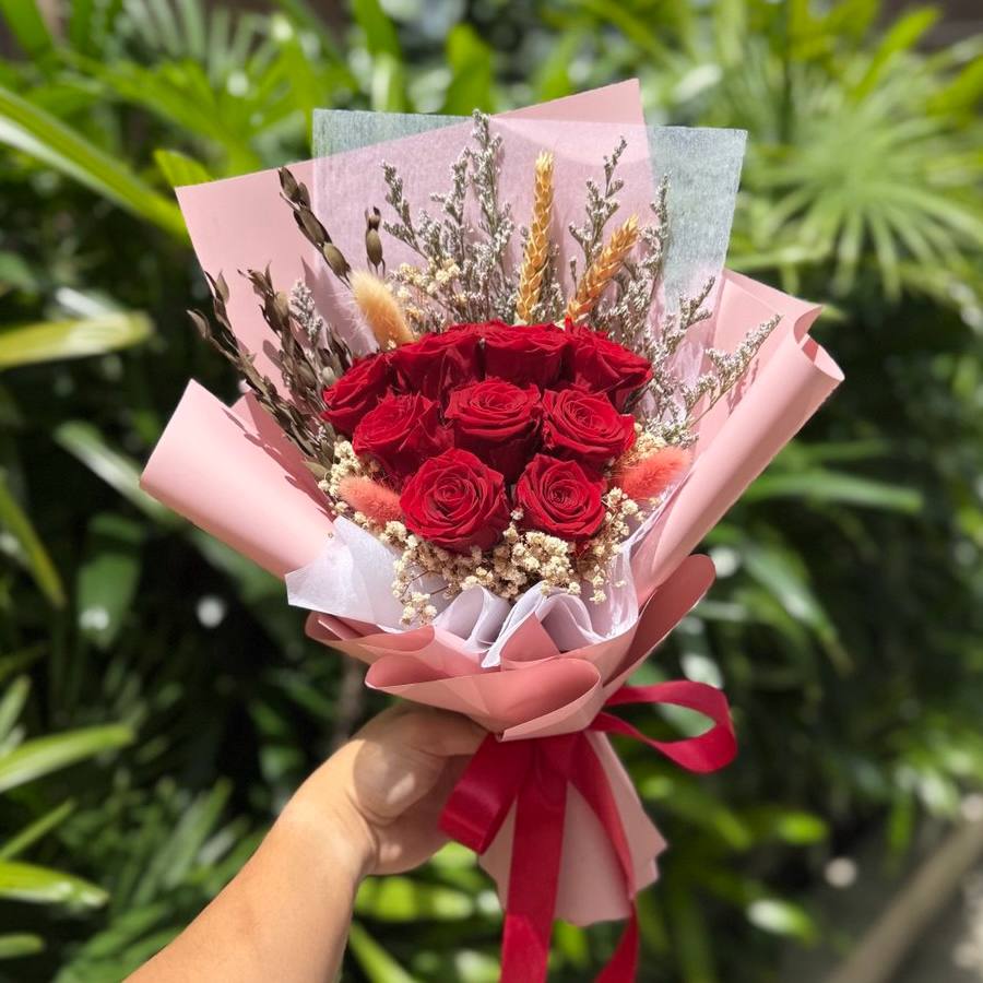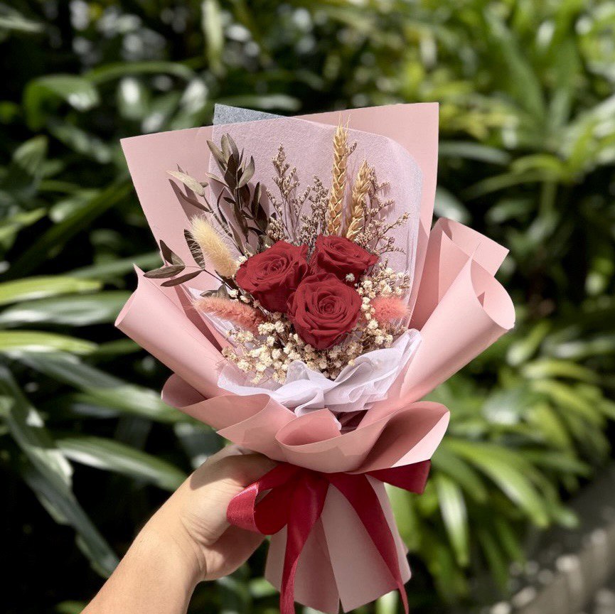 A classic bouquet of 3 preserved red roses, paired with accompanying florals and foliage. Exudes both vibrance and class, perfect for that girl who always has a sparkle in her eye.